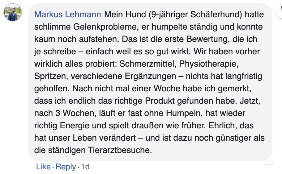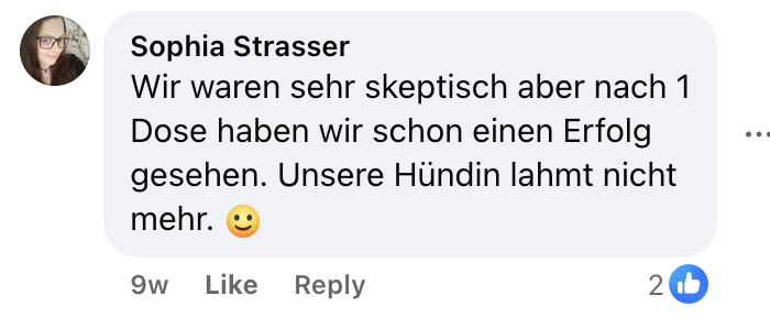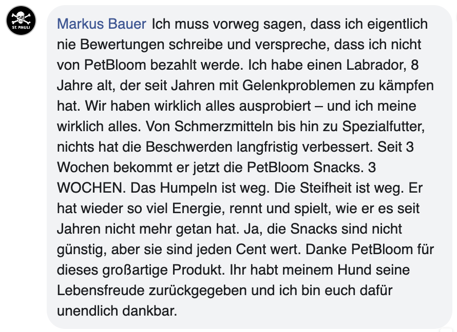 Nach nur zwei Wochen mit den PetBloom Snacks konnten wir schon den Unterschied sehen. Er läuft deutlich lockerer, das Humpeln ist fast verschwunden, und er wirkt wieder voller Energie. Für uns ist es unglaublich, nach so langer Zeit endlich Fortschritte zu sehen.