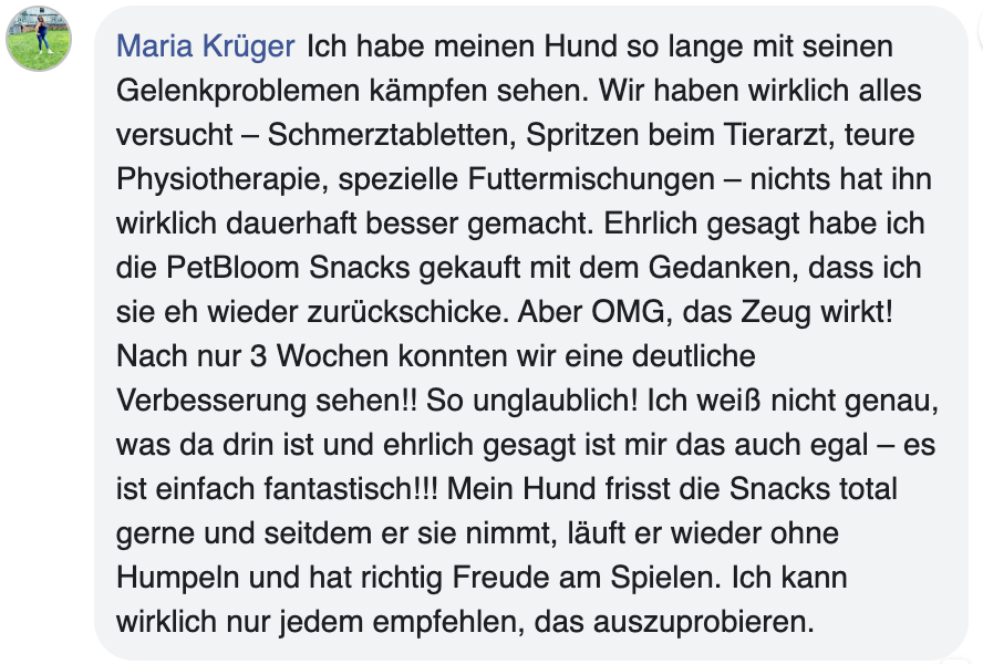 Die PetBloom Gelenksnacks wurden über 2 Jahre entwickelt um alle Gelenkschmerzen & Steifheit schnell und dauerhaft zu beseitigen.