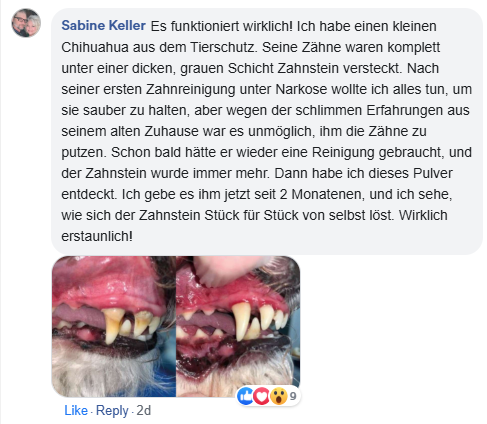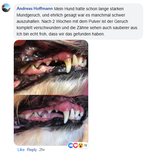 Mein Hund hatte über längere Zeit extremen Mundgeruch, und wir waren ehrlich gesagt überzeugt, dass so ein Pulver nicht wirklich helfen kann.