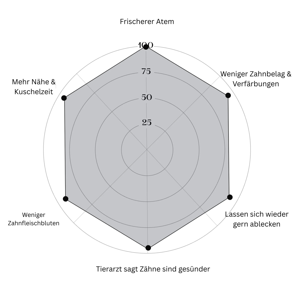 Doch nach sechs Wochen war der Unterschied nicht zu übersehen. Sein Atem riecht neutral, das Zahnfleisch ist wieder rosa, die braunen Ränder an den Zähnen verschwinden und er kann wieder problemlos kauen. Er frisst wieder mit Appetit, kaut begeistert seine Spielzeuge und lässt sich endlich wieder küssen.