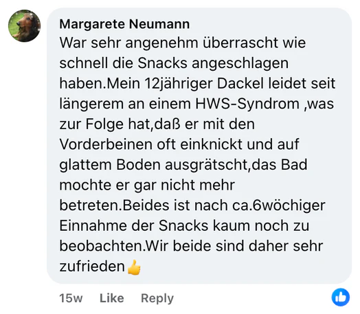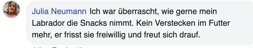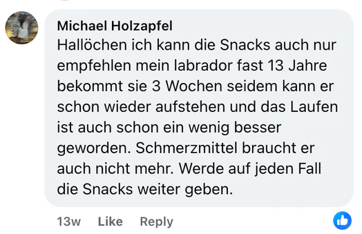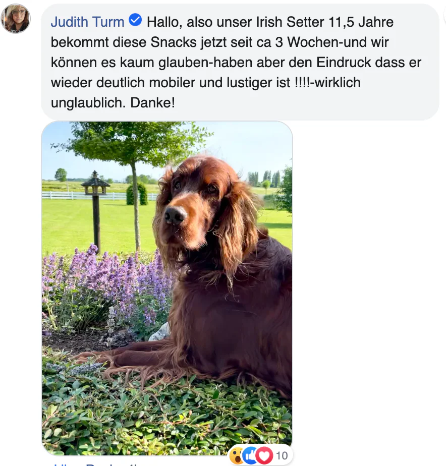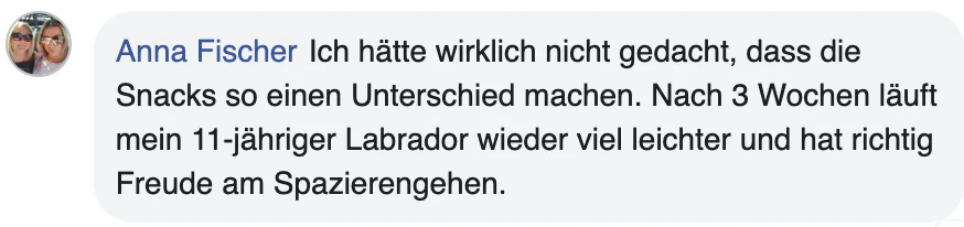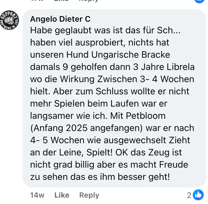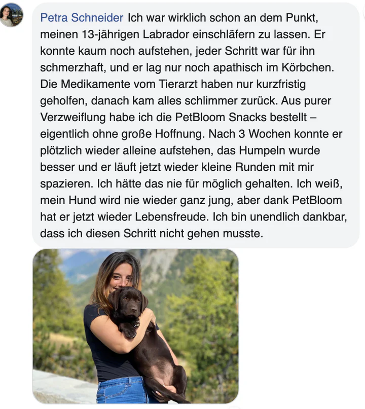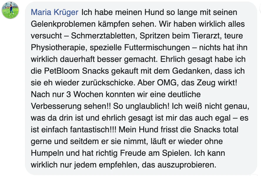 “Hat die Gelenkprobleme meines Hundes komplett gelöst – und das ohne jede Nebenwirkung. Vorher halfen nur Schmerzmittel, aber die haben ihn richtig müde und schlapp gemacht. Seine Schmerzen waren so stark, dass er kaum noch laufen wollte. Ich habe PetBloom erst probiert, nachdem ich bereits über 2000€ für andere Behandlungen ausgegeben hatte. Nach zwei Wochen ging es ihm schon deutlich besser. Jetzt, anderthalb Monate später, humpelt er überhaupt nicht mehr. Ich kann es immer noch kaum glauben – deshalb schreibe ich auch meine erste Bewertung überhaupt, weil es wirklich so gut funktioniert hat.”
