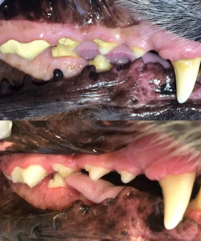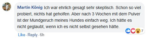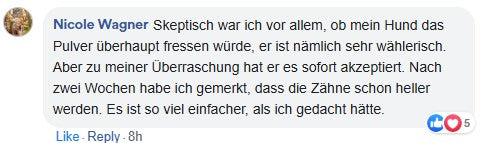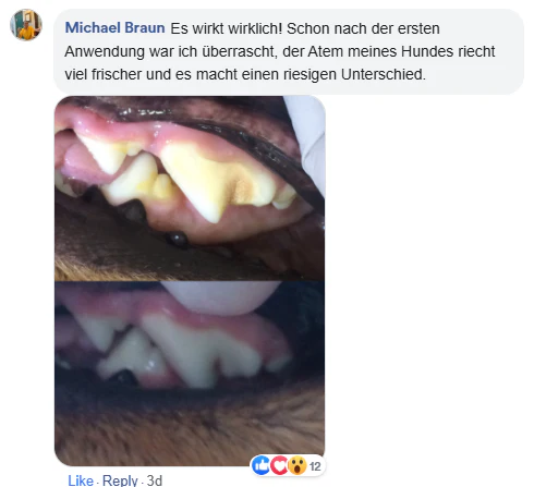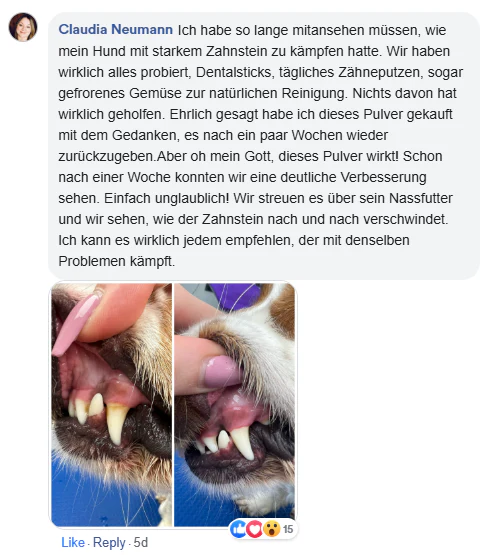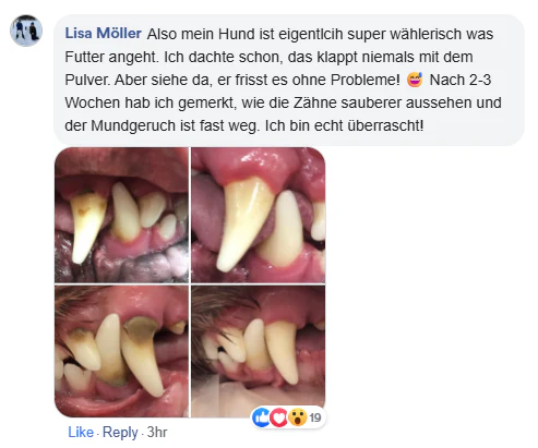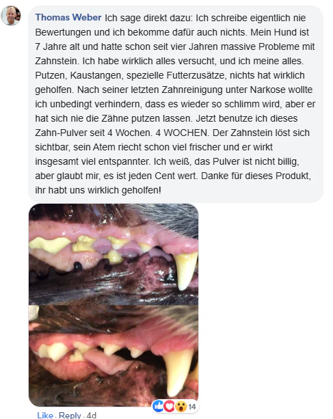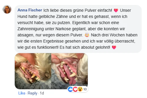 Ich kämpfe mit den Zahnproblemen meines Hundes seit er 3 Jahre alt war. Nach über 4 Jahren Tierärzten, Narkose-Reinigungen, Dentalsticks, Zahnbürsten und was auch immer die Trend-Behandlung des jeweiligen Jahres war, habe ich etwas gefunden das tatsächlich funktioniert. Dieses Pulver wirkt wirklich bei ihm. Ich bin überraschend schockiert und erfreut.