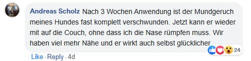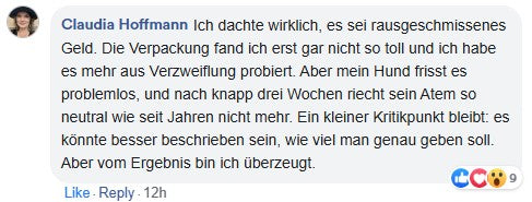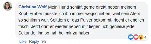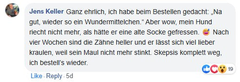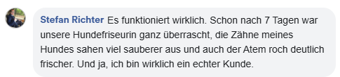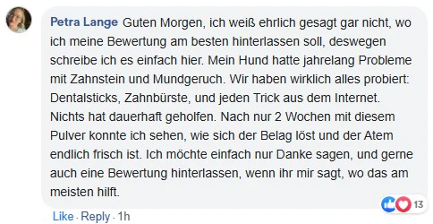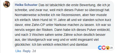 Hat Zahnbelag und Zahnstein meines Hundes komplett beseitigt und das ohne Narkose-Risiko. Das einzige was vorher half waren teure Zahnreinigungen aber die hielten nur wenige Monate. Sein Mundgeruch war überall so schlimm und ich probierte PetBloom nachdem ich über 2000€ für andere Sachen rausgeschmissen hatte. Nach vier Tagen roch sein Atem schon neutral. Anderthalb Monate später und sein Zahnfleisch blutet kein bisschen mehr und sein Zahnbelag ist auch weg, seit er das Pulver bekommt. Unglaubliches Zeug. Kann es immer noch nicht fassen. Das ist die erste Bewertung die ich je geschrieben habe weil es so gut funktioniert hat.